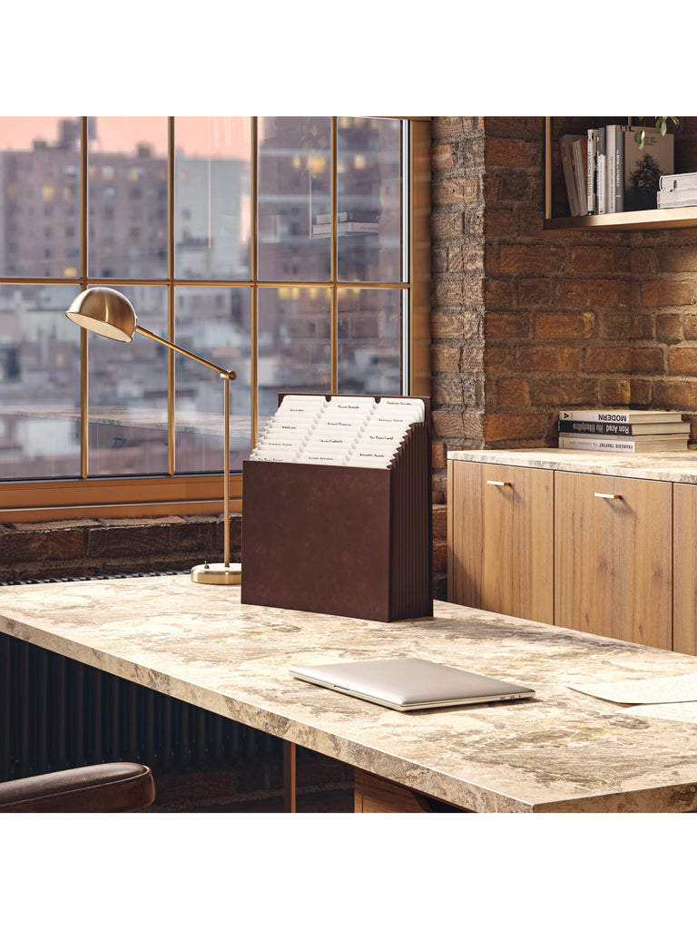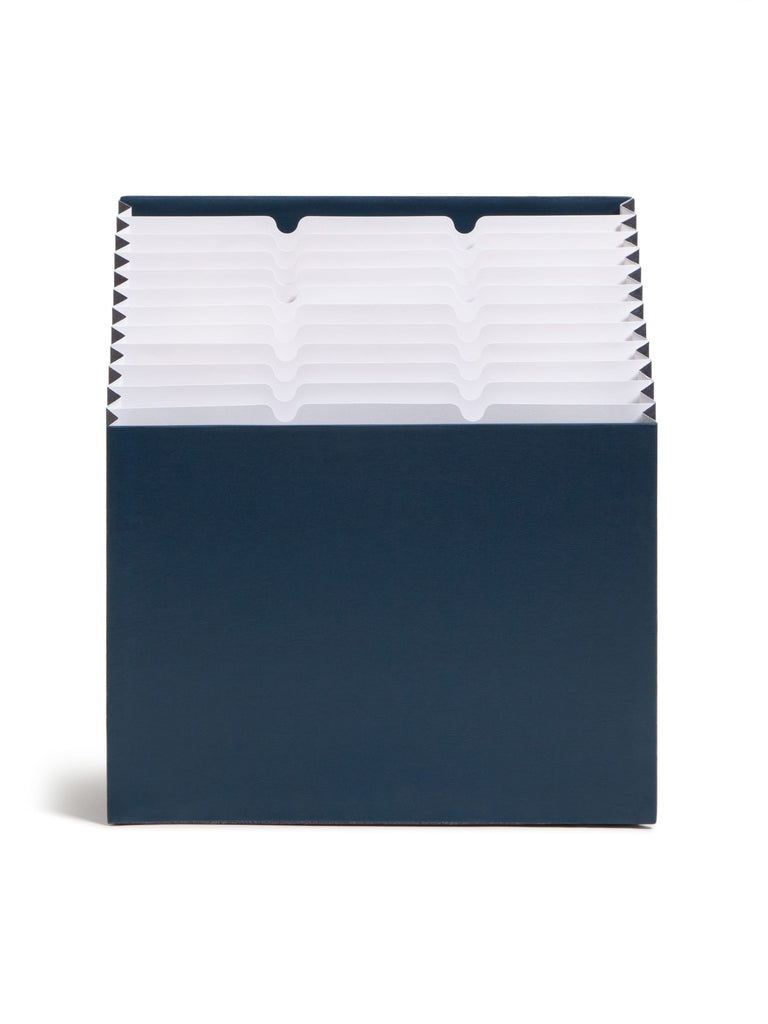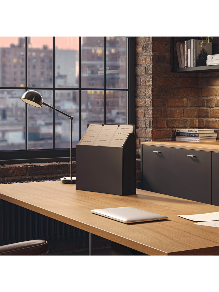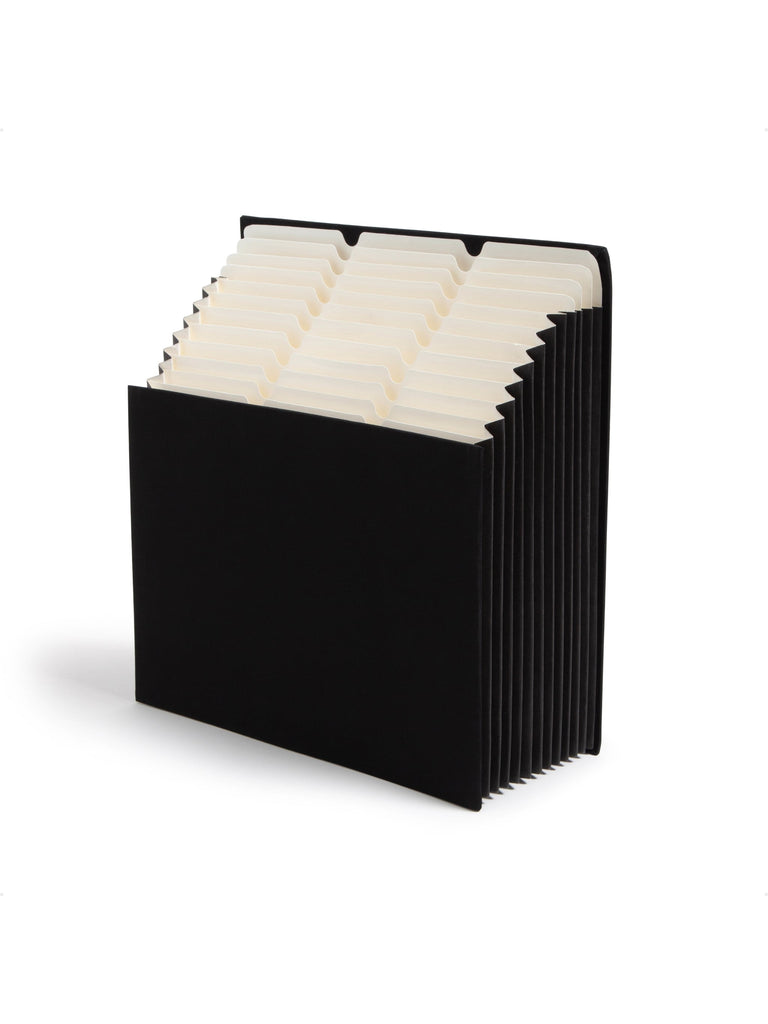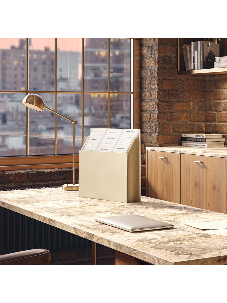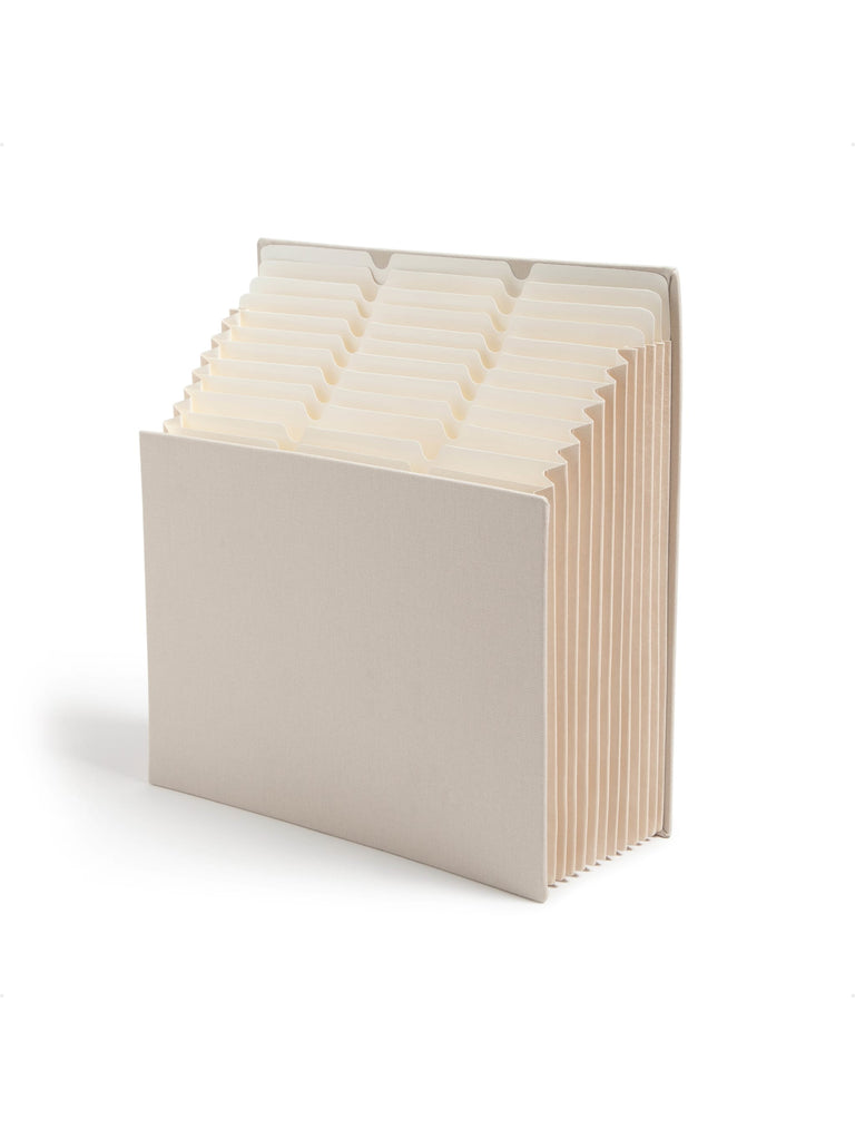 Subtle and sophisticated storage, the Smead® Stadium File provides innovative upright document organization with a refined touch. Its patented tiered tabbed pockets keep every tab visible at a glance, so you can quickly and easily locate important documents, making it a perfect desk organizer. The durable reinforced expandable gussets provide added stability and room to accommodate growing files. Perfect for taming clutter on your desk, counter, or shelf, this sleek file organizer adds decorative neutral accents to any office or home. Measuring 12.75" x 13.75" and expanding up to 11.75", it offers a spacious solution for keeping everything in order. Pair with the Smead® Flip Top Storage Box for a cohesive, clutter-free look that is as practical as it is chic.