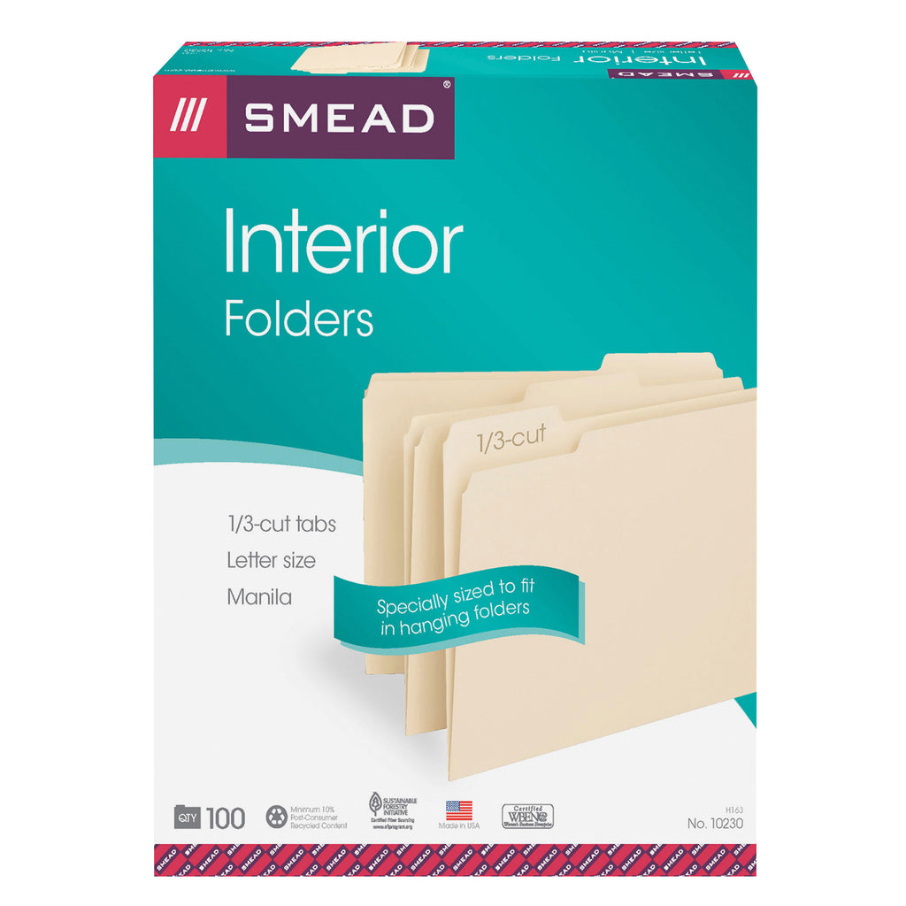 Keep documents organized when removed from the file drawer. These special size folders fit neatly inside hanging folders so the tabs are hidden when returned to the file. Assorted tab positions allow more than one interior folder to be used within a single hanging folder.